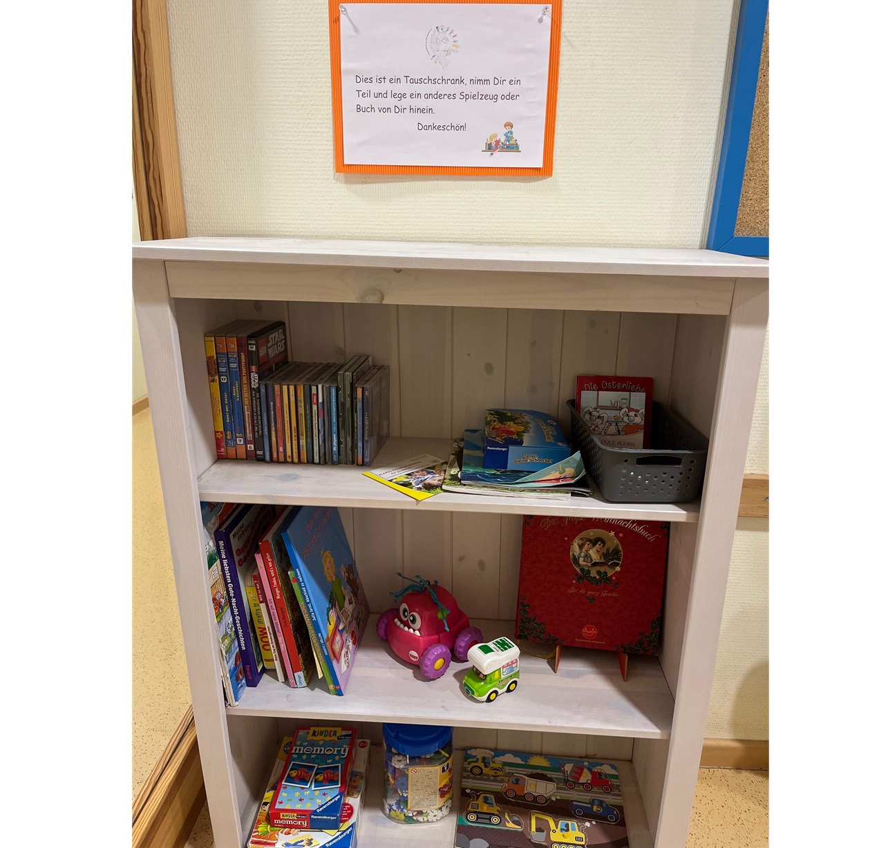 Der Tauschschrank dient dazu, den Kindern und Eltern einen bewussten Umgang von Konsum und Verzicht nahe zu bringen. Der Schrank ist für alle Familien im Eingangsbereich frei zugänglich. Hier befinden sich Spielmaterialien, Bücher und CDs, die von Zuhause mitgebracht werden und gegen ein anderes Material kostenfrei ausgetauscht werden können.