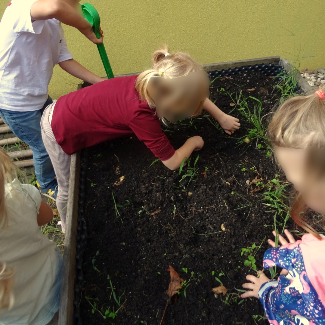 Zum Thema Natur und Artenvielfalt lernten die Kinder, sowohl die U3 wie die Ü3 Kinder, Schritt für Schritt, wie Pflanzen wachsen und gepflegt werden. Den Einstieg bildete ein Bilderbuch über den Weg einer Tomate vom Samen bis zur Ernte. Zum „Pflanz eine Blume“-Tag wurde eine Elternaktion geplant. Die Eltern unterstützten das Projekt, indem sie Erde oder Samen mitbrachten. Die Kinder bereiteten anschließend das Hochbeet vor, wählten Pflanzen aus und beobachteten deren Entwicklung. Zunächst setzten sie Samen in Gläser, die auf der Fensterbank standen. Sobald erste Wurzeln sichtbar waren, pflanzten sie die Keimlinge ins Hochbeet im Garten um. So erfuhren die Kinder auf spielerische Weise, was Pflanzen zum Wachsen brauchen, entwickelten Verantwortung und wurden für natürliche Kreisläufe sensibilisiert.